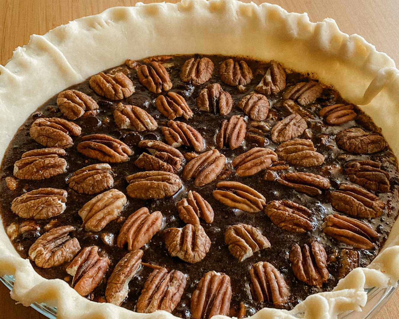 - Pour the filling mixture into the prepared pie crust. Arrange the reserved whole pecans on top in a decorative pattern.
